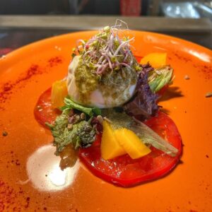op onze ‘green Eggs’ houtskoolgrill. De “green eggs’ komen oorspronkelijk uit Japan en zijn een gesloten keramisch fornuis waarin gerechten worden gegrild, gerookt en geroosterd om de smaken te versterken en te intensifiëren. Een collectie van zorgvuldig samengestelde individuele gerechten om te bekijken en te kiezen, allemaal vakkundig en speciaal voor u bereid.